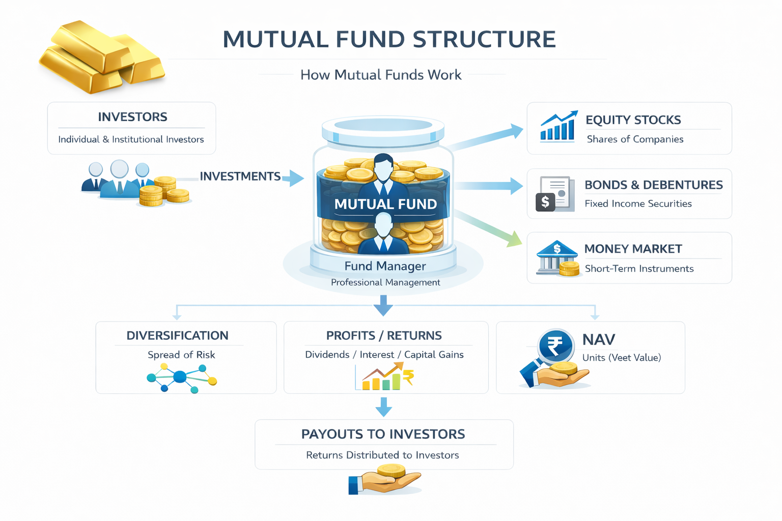 Mutual funds collect money from various investors to invest in a range of assets, including stocks, bonds, ETFs, and commodities. Managed by professionals, your capital works on your behalf through a diversified unit-based system.